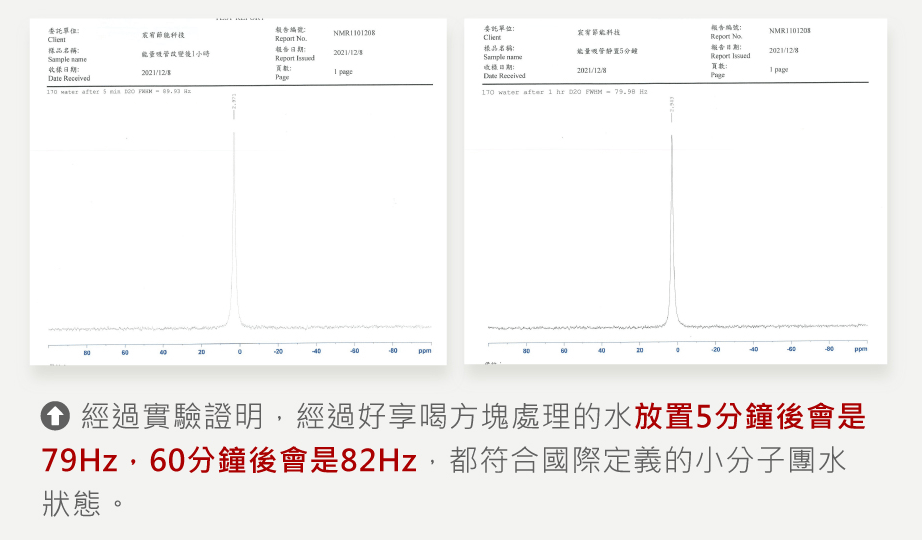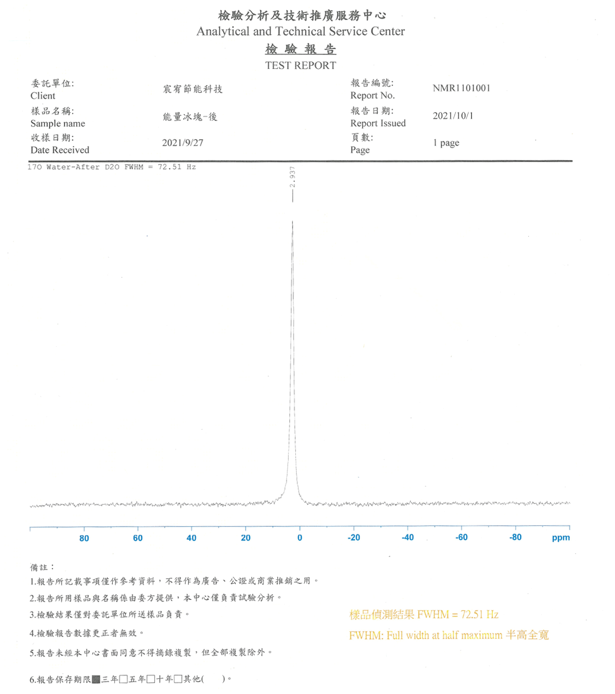 依據國際的定義17O-NMR 的半峰寬低於 90Hz(不到 10 個水分子)的水稱為小分子團水,一般自來水半峰寬值高於110Hz,我們在實驗室所做的17O NMR核磁共振測試,經過改變後的水半峰寬值降為72Hz。