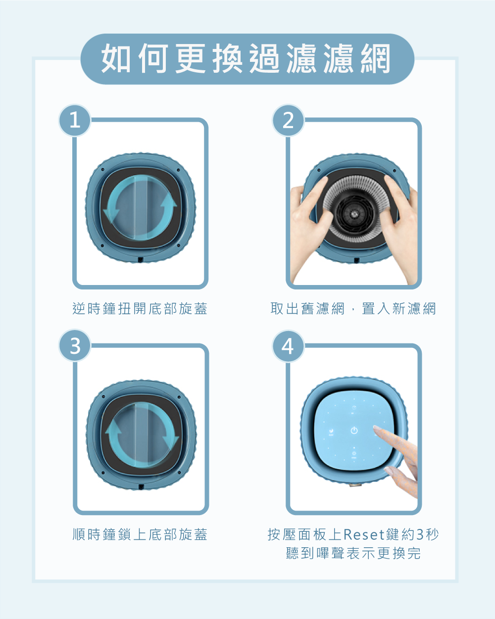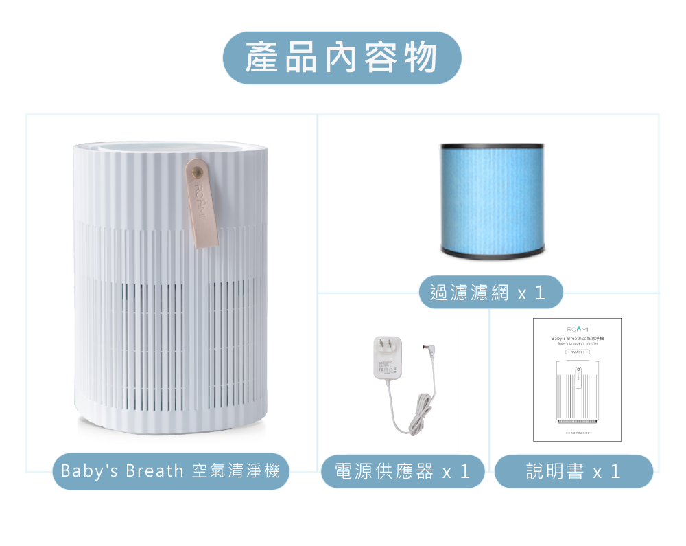 內容物:主機*1、AC電源供應器*1、說明書*1、濾網*1(已裝在主機內,初次使用請寄得拆封外袋)