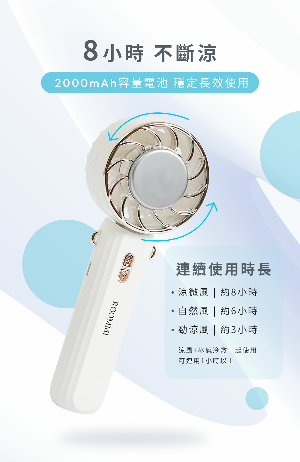 。2000mAh容量電池,最長8小時不斷涼